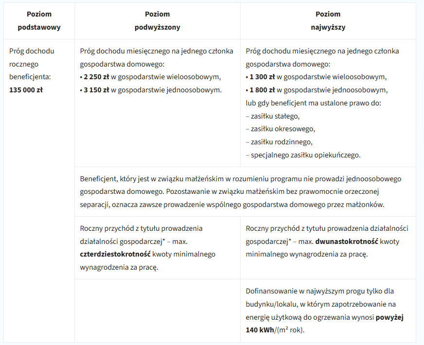 - zarobki od 1300 do 2250 zł na miesiąc w gospodarstwie wieloosobowym – podwyższony próg dochodowy – droga do dotacji otwarta - większe możliwe dofinansowanie niż przy podstawowym progu, ale niższe niż przy najwyższym. Przy gospodarstwie jednoosobowym zarobki od 1800 zł do 3150 zł. Uwaga przy tym poziomie dofinansowania potrzebujemy „kwitu” potwierdzającego zarobki od oficjalnej instytucji np. MOPS – ktoś musi przybić pieczątkę i potwierdzić dochód.